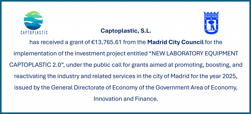 Captoplastic S.L has obtained funding for the CaptH20PlasticDemo project - S-2020/L1-633 through grants co-financed by the European Regional Development Fund for the development of innovative young technology-based companies (start-ups) and highly innovative SMEs, within the framework of the regional research and innovation strategy for smart specialization (RIS3), under the FEDER operational program of the Community of Madrid for the period 2014-2020.